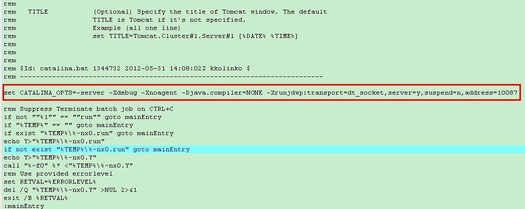 set CATALINA_OPTS=-server -Xdebug -Xnoagent -Djava.compiler=NONE -Xrunjdwp:transport=dt_socket,server=y,suspend=n,address=10087