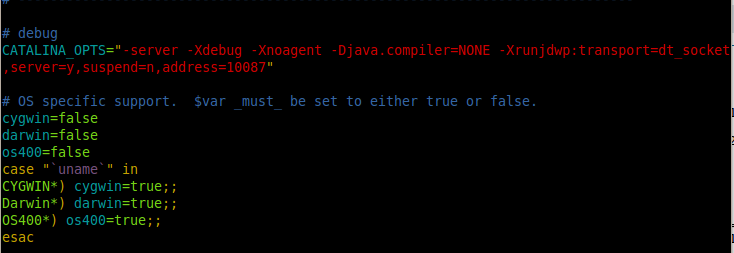 CATALINA_OPTS="-server -Xdebug -Xnoagent -Djava.compiler=NONE -Xrunjdwp:transport=dt_socket,server=y,suspend=n,address=10087"