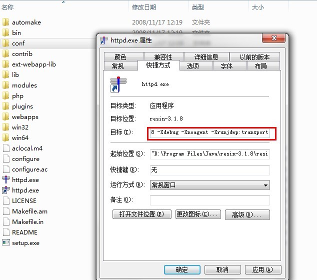 D:\Program Files\Java\resin-3.1.8\resin-3.1.8-Xdebug -Xnoagent -Xrunjdwp:transport=dt_socket,server=y,suspend=n,address=1234 -conf D:\Program Files\Java\resin-3.1.8\resin-3.1.8\conf\resin.conf -Xms128M -Xmx1024M