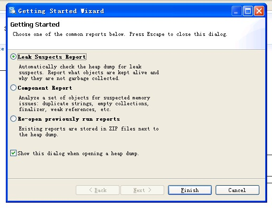 因为我们就是为了查找内存泄漏的问题,所以保持默认选项直接点“Finish”就可以。