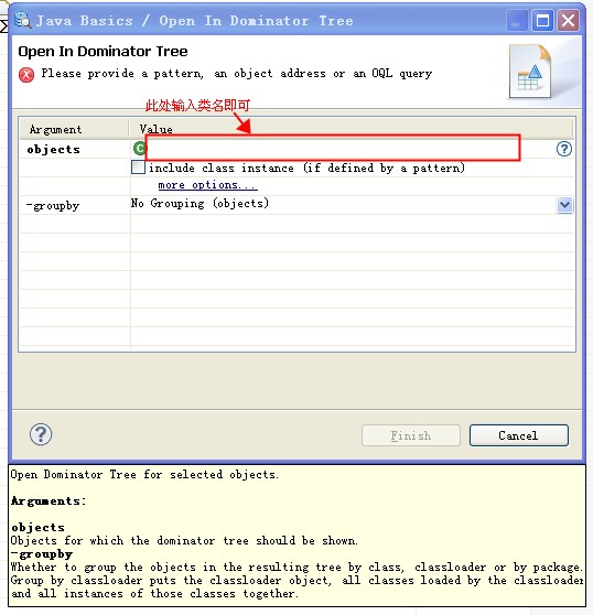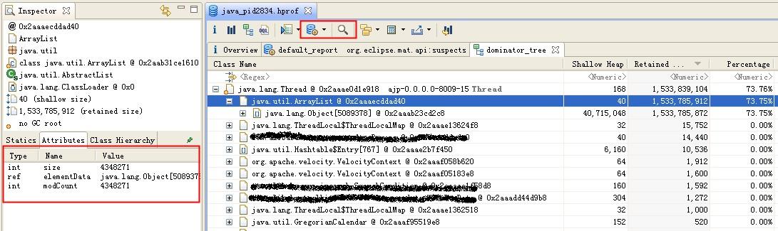 这个视图的左边大区域可以看到对象的依赖关系,选中某个对象以后可以在左边小窗口查看对象的一些属性。如果属性的值是一些内存地址你还可以点击工具栏的搜索按钮来搜索具体的对象信息。在进行具体分析的时候MAT只是起了帮助你进行分析的工具的功能,OOM问题分析没有固定方法和准则。只能发挥你敏锐的洞察力,结合源代码,对内存中的对象进行分析从而找到代码中的BUG.