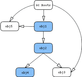 从obj1入手,上图中蓝色节点代表仅仅只有通过obj1才能直接或间接访问的对象。因为可以通过GC Roots访问,所以左图的obj3不是蓝色节点;而在右图却是蓝色,因为它已经被包含在retained集合内。