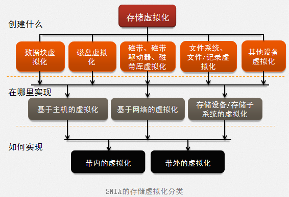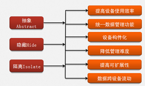 存储虚拟化概念 1、什么是存储虚拟化 SNIA(存储网络工业协会)对存储虚拟化的定义:通过对存储子系统或存储服务的内部功能进行抽象、隐藏或隔离,使存储或数据的管理与应用、服务器、网络资源的管理分离,从而实现应用和网络的独立管理。 简而言之,就是物理资源和逻辑资源不再是一一对应的关系,可以是一对多或者多对一,而这种关系对于用户是透明的。2、为什么要存储虚拟化 3、存储虚拟化的实现方式