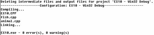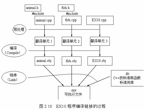 从这个输出中,我们可以看到可执行程序EX10.exe的产生,经过了两个步骤:首先,C++编译器对工程中的三个源文件fish.cpp、animal.cpp单独进行编译(Compiling…)。在编译时,先由预处理器对预处理指令(#include、#define和#if)进行处理,在内存中输出翻译单元(一种临时文件)。编译器接受预处理的输出,将源代码转换成包含机器语言指令的三个目标文件(扩展名为obj的文件):EX10.obj、fish.obj、animal.obj。注意,在编译过程中,头文件不参与编译;在EX10工程的Debug目录下,我们可以看到编译生成的obj文件。接下来是链接过程(Linking…),链接器将目标文件和你所用到的C++类库文件一起链接生成EX10.exe。整个编译链接的过程如下图所示。