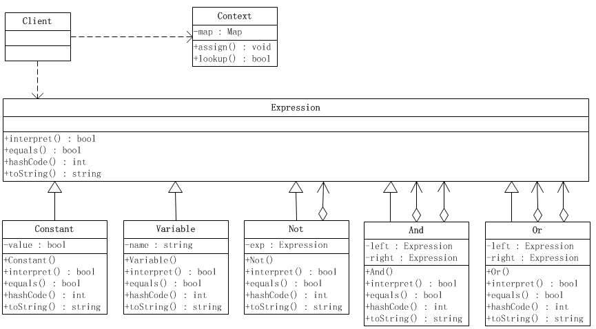 为了说明解释器模式的实现办法,这里给出一个最简单的文法和对应的解释器模式的实现,这就是模拟Java语言中对布尔表达式进行操作和求值。
