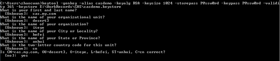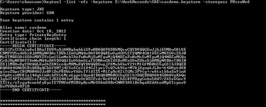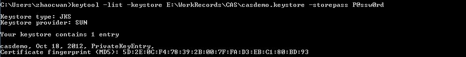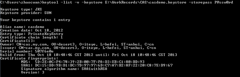 keytool -list -v -keystore E:\WorkRecords\CAS\casdemo.keystore -storepass P@ssw0rd