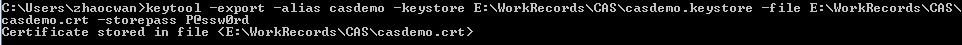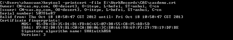 查看导出的证书信息:keytool -printcert -file E:\WorkRecords\CAS\casdemo.crt