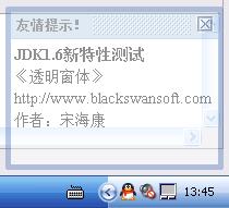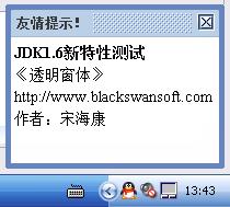 String message="<strong>JDK1.6新特性测试</strong><br>《透明窗体》<br>http://www.blackswansoft.com<br>作者:宋海康";