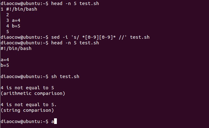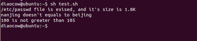 if [ -e "/etc/passwd" ]; thensize=`ls -l -h /etc/passwd | awk '{print $5}'`echo "/etc/passwd file is exised, and it's size is $size"fistr1="nanjing"str2="beijing"if [ "$str1" = "$str2" ]; thenecho "$str1 equals to $str2"elseecho "$str1 doesn't equals to $str2"finum1=100num2=105if [ "$num1" -gt "$num2" ]; thenecho "$num1 is greater than $num2"elseecho "$num1 is not greater than $num2"fi