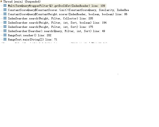 //返回TermRangeTermEnum对象,这个对象先用用小的那个string new一个term,然后定位到tis文件,while循环读取term信息,然后去frg文件里面读取docId,在while循环里面,通过SegmentTermDocs读取frg文件的docId和frg。