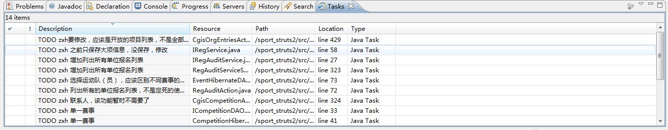 以Task View为例,刚开始的时候没怎么注意它,更多的时候是关掉,有一次偶然的机会,发现它竟然可以将Java代码里的一些具有关键字的行内容抽取出来,这可是一个好东西啊,它完全可以令程序员在代码是加入自己的书签。按我自己以往的编程习惯,发现一个重要点、修改点之类的,我一般会用Eclipse的Bookmark功能将它们记录起来,但这有一个问题,但这有一个问题:这些Bookmark无法与其它人进行共享。而Task View正好可以解决这个问题,你可以在需要标记的地方加上Task View的关键字(这些关键字均可自定义,也可定义优先级),一旦加上Task View中的关键字,你就可以从Task View找到这些已标记的地方,也可以快速跳转到这些地方,最大的好处就是这个标签可以直接添加在代码上,在绝不影响代码功能的前提下,将你的标签信息通过代码传递给其它的开发者。
