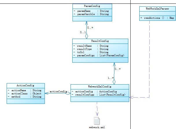 利用java反射模拟struts2工作(三) 正在学习UML,所以就趁此机会将这次的模拟工作用UML简要的画了一下,使用的工具是PowerDesigner12.5,由于实现过程已经完成了,再来绘制UML图,属于逆向工程了。先附上第一次所需的Model类和读取配置文件的一些个相关东西。第二次主要是客户端对服务器的访问控制,以及相应客户端的相关类图。哎,画得确实不咋滴,不过学习嘛,总有一个过程,记一下。