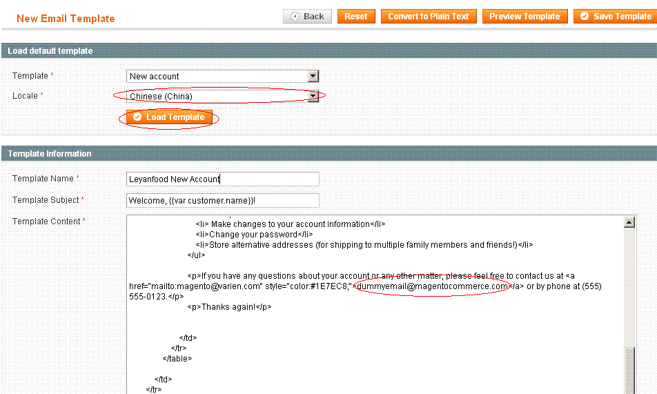 2.选择中文,点击Load Template装载默认的Template.注意右下角的dummyemail@magentocommerce.com,修改为你想要得email值,然后存储。