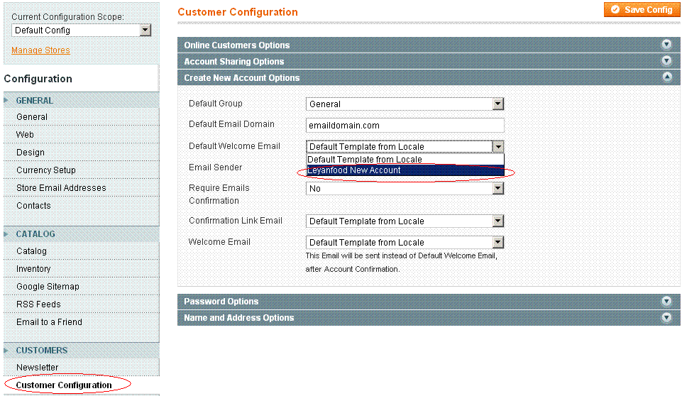 3. 进入System->Configuration的Customers Tab,见下图,将Default Welcome Email选择为你刚刚建立的模板:Leyanfood New Account.