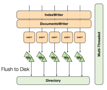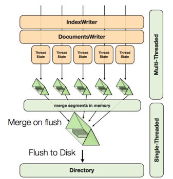 lucene在索引时,会先构建一个内存的索引,然后再flush到持久化存储中。在内存内部,会有多个小的段(segment),在需要flush的时候,才会合并到一起;这些小的段,可以并行的提供索引服务(即并发)。IndexWrite使用DocumentsWriter将索引数据通过一个私有线程写入到段中。见下图: