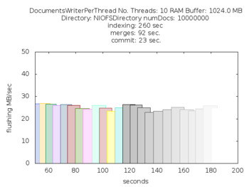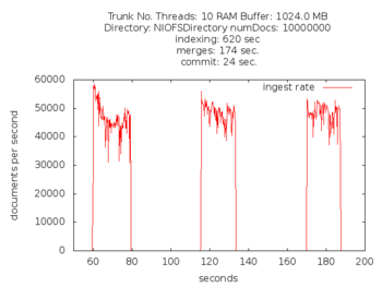 非常惊人的结果,多线程在后台不断地添加文档数据到索引中。峰值较trunk比稍微有些下降,这是因为在后台flush索引时,会有一些的线程切换。
