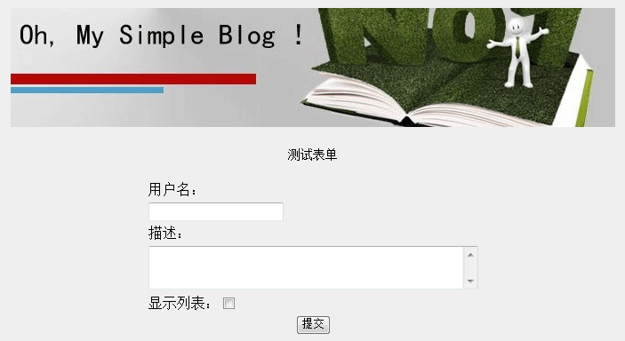 #extends /User/master#override title首页#override content测试表单<form action="/User/test" method="post"><table><tr><td>用户名:</td></tr><tr><td><input name="name" id="用户名" maxlength="20" /><br /></td></tr><tr><td>描述:</td></tr><tr><td><textarea name="description" id="描述"maxlength="500" rows="3" cols="50"></textarea></td></tr><tr><td>显示列表:<input type="checkbox" name="showList" value="true" /></td></tr><tr><td align="center"><input type="submit" value="提交"></td></tr></table></form>
