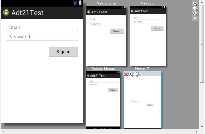 package com.example.adt21test;import android.animation.Animator;import android.animation.AnimatorListenerAdapter;import android.annotation.TargetApi;import android.app.Activity;import android.os.AsyncTask;import android.os.Build;import android.os.Bundle;import android.text.TextUtils;import android.view.KeyEvent;import android.view.Menu;import android.view.View;import android.view.inputmethod.EditorInfo;import android.widget.EditText;import android.widget.TextView;/** * Activity which displays a login screen to the user, offering registration as * well. */public class LoginActivity extends Activity {/** * A dummy authentication store containing known user names and passwords. * TODO: remove after connecting to a real authentication system. */private static final String[] DUMMY_CREDENTIALS = new String[] {"foo@example.com:hello", "bar@example.com:world" };/** * The default email to populate the email field with. */public static final String EXTRA_EMAIL = "com.example.android.authenticatordemo.extra.EMAIL";/** * Keep track of the login task to ensure we can cancel it if requested. */private UserLoginTask mAuthTask = null;// Values for email and password at the time of the login attempt.private String mEmail;private String mPassword;// UI references.private EditText mEmailView;private EditText mPasswordView;private View mLoginFormView;private View mLoginStatusView;private TextView mLoginStatusMessageView;@Overrideprotected void onCreate(Bundle savedInstanceState) {super.onCreate(savedInstanceState);setContentView(R.layout.activity_login);// Set up the login form.mEmail = getIntent().getStringExtra(EXTRA_EMAIL);mEmailView = (EditText) findViewById(R.id.email);mEmailView.setText(mEmail);mPasswordView = (EditText) findViewById(R.id.password);mPasswordView.setOnEditorActionListener(new TextView.OnEditorActionListener() {@Overridepublic boolean onEditorAction(TextView textView, int id,KeyEvent keyEvent) {if (id == R.id.login || id == EditorInfo.IME_NULL) {attemptLogin();return true;}return false;}});mLoginFormView = findViewById(R.id.login_form);mLoginStatusView = findViewById(R.id.login_status);mLoginStatusMessageView = (TextView) findViewById(R.id.login_status_message);findViewById(R.id.sign_in_button).setOnClickListener(new View.OnClickListener() {@Overridepublic void onClick(View view) {attemptLogin();}});}@Overridepublic boolean onCreateOptionsMenu(Menu menu) {super.onCreateOptionsMenu(menu);getMenuInflater().inflate(R.menu.activity_login, menu);return true;}/** * Attempts to sign in or register the account specified by the login form. * If there are form errors (invalid email, missing fields, etc.), the * errors are presented and no actual login attempt is made. */public void attemptLogin() {if (mAuthTask != null) {return;}// Reset errors.mEmailView.setError(null);mPasswordView.setError(null);// Store values at the time of the login attempt.mEmail = mEmailView.getText().toString();mPassword = mPasswordView.getText().toString();boolean cancel = false;View focusView = null;// Check for a valid password.if (TextUtils.isEmpty(mPassword)) {mPasswordView.setError(getString(R.string.error_field_required));focusView = mPasswordView;cancel = true;} else if (mPassword.length() < 4) {mPasswordView.setError(getString(R.string.error_invalid_password));focusView = mPasswordView;cancel = true;}// Check for a valid email address.if (TextUtils.isEmpty(mEmail)) {mEmailView.setError(getString(R.string.error_field_required));focusView = mEmailView;cancel = true;} else if (!mEmail.contains("@")) {mEmailView.setError(getString(R.string.error_invalid_email));focusView = mEmailView;cancel = true;}if (cancel) {// There was an error; don't attempt login and focus the first// form field with an error.focusView.requestFocus();} else {// Show a progress spinner, and kick off a background task to// perform the user login attempt.mLoginStatusMessageView.setText(R.string.login_progress_signing_in);showProgress(true);mAuthTask = new UserLoginTask();mAuthTask.execute((Void) null);}}/** * Shows the progress UI and hides the login form. */@TargetApi(Build.VERSION_CODES.HONEYCOMB_MR2)private void showProgress(final boolean show) {// On Honeycomb MR2 we have the ViewPropertyAnimator APIs, which allow// for very easy animations. If available, use these APIs to fade-in// the progress spinner.if (Build.VERSION.SDK_INT >= Build.VERSION_CODES.HONEYCOMB_MR2) {int shortAnimTime = getResources().getInteger(android.R.integer.config_shortAnimTime);mLoginStatusView.setVisibility(View.VISIBLE);mLoginStatusView.animate().setDuration(shortAnimTime).alpha(show ? 1 : 0).setListener(new AnimatorListenerAdapter() {@Overridepublic void onAnimationEnd(Animator animation) {mLoginStatusView.setVisibility(show ? View.VISIBLE: View.GONE);}});mLoginFormView.setVisibility(View.VISIBLE);mLoginFormView.animate().setDuration(shortAnimTime).alpha(show ? 0 : 1).setListener(new AnimatorListenerAdapter() {@Overridepublic void onAnimationEnd(Animator animation) {mLoginFormView.setVisibility(show ? View.GONE: View.VISIBLE);}});} else {// The ViewPropertyAnimator APIs are not available, so simply show// and hide the relevant UI components.mLoginStatusView.setVisibility(show ? View.VISIBLE : View.GONE);mLoginFormView.setVisibility(show ? View.GONE : View.VISIBLE);}}/** * Represents an asynchronous login/registration task used to authenticate * the user. */public class UserLoginTask extends AsyncTask<Void, Void, Boolean> {@Overrideprotected Boolean doInBackground(Void... params) {// TODO: attempt authentication against a network service.try {// Simulate network access.Thread.sleep(2000);} catch (InterruptedException e) {return false;}for (String credential : DUMMY_CREDENTIALS) {String[] pieces = credential.split(":");if (pieces[0].equals(mEmail)) {// Account exists, return true if the password matches.return pieces[1].equals(mPassword);}}// TODO: register the new account here.return true;}@Overrideprotected void onPostExecute(final Boolean success) {mAuthTask = nul