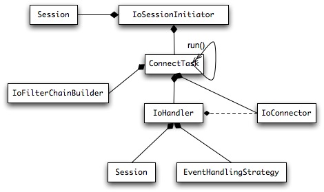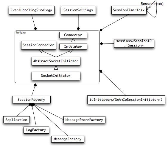 处于核心位置的是Initiator,具体如图上表示的一系列继承关系构成,正是Initiator将QuickFix/J的大多数的核心功能组合在一起,成为一个整体。而各个核心组件之间的关系非常松散,多数都可以由XXXFactory生成。Initiator由大约6核心个组件组成,分别是处理消息的EventHandlerStrategy,存储配置的SessionSettings,存储所有session的容器sessions,存储所有IoSessionInitiator的容器ioInitiators,SessionFactory,以及QuickFix/J客户端的“发动机”SessionTimerTask。SessionTimerTask在启动Initiator时触发,并持续一直运行,直到被取消运行为止,它定时检查Session中所有状态并做相关操作,细节请参考QuickFix/J 源代码研究(一)中的A-5。