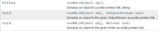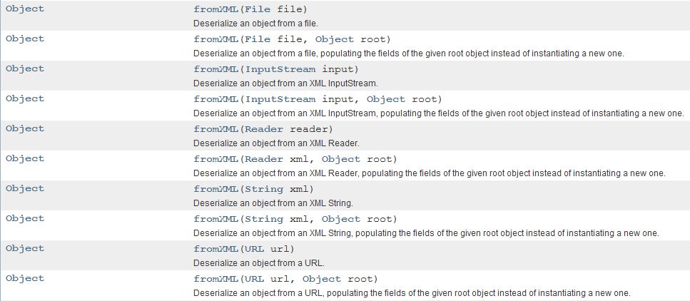 采用xstream实现javabean和xml互转(1)中是对xml字符串和javabean之间进行互转,其实xstream也支持xml文件和javabean之间互转,甚至还支持直接通过某个xml文档的url地址和javabean之间互转,在官网api文档中可以看到:
