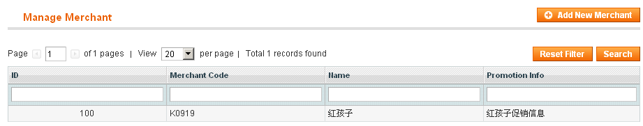 2. 使http://magen_host/manager/merchant进入Merchant管理界面,默认显示Merchant列表。