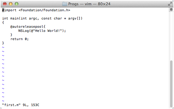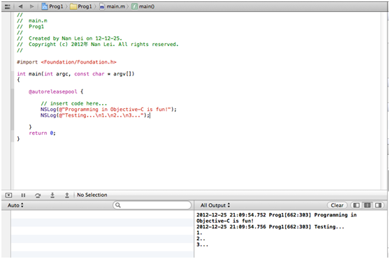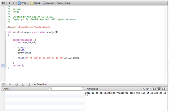 #import <Foundation/Foundation.h>int main(int argc, const char * argv[]){ @autoreleasepool { // insert code here... NSLog(@"Programming in Objective-C is fun!"); NSLog(@"Testing...\n1.\n2..\n3..."); } return 0;}#import <Foundation/Foundation.h>int main(int argc, const char * argv[]){ @autoreleasepool { int sum,v1,v2; v1=12; v2=25; sum=v1+v2; NSLog(@"The sum of %i and %i is %i",v1,v2,sum); } return 0;}