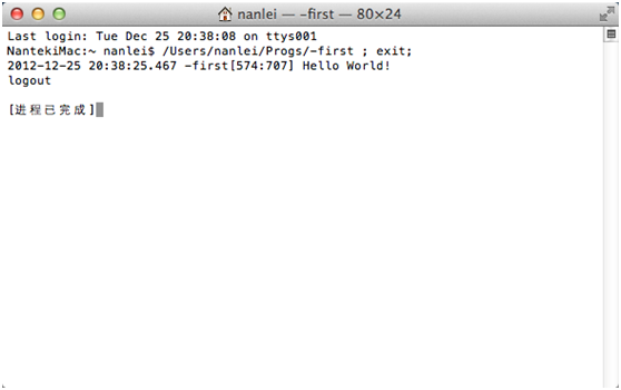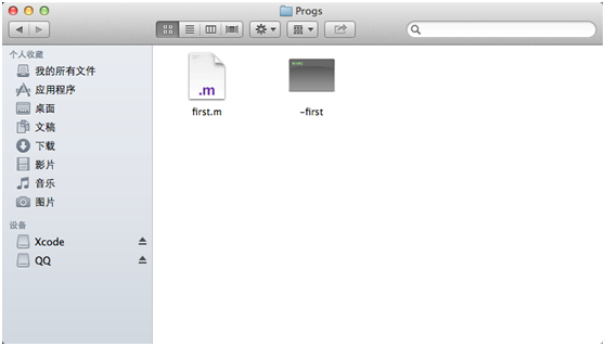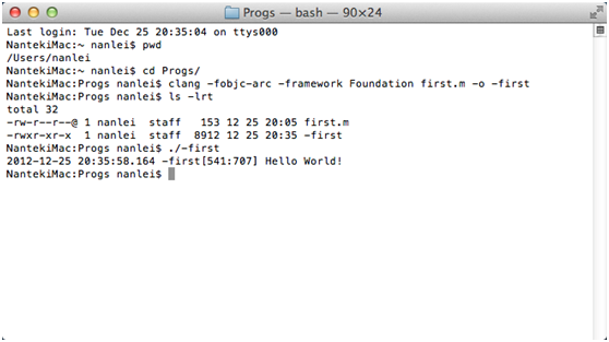 使用clang编译Objective-C程序时,需要使用-framework来指定我们使用的库Foundation,-o表示生成目标文件的名称,我们设置为-first,那么成功编译后,我们就看到了生成的可执行文件,在Terminal中使用./-first来执行程序就会得到输出,当然也可以点击可执行文件来打开它。