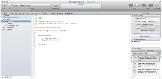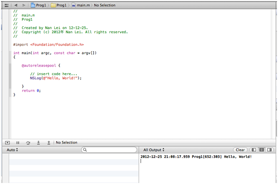 //// main.m// Prog1//// Created by Nan Lei on 12-12-25.// Copyright (c) 2012年 Nan Lei. All rights reserved.//#import <Foundation/Foundation.h>int main(int argc, const char * argv[]){ @autoreleasepool { // insert code here... NSLog(@"Hello, World!"); } return 0;}