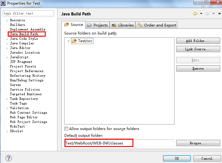 先创建项目:New -> Dynamic Web Project,起个名字完成。目录就创建好了,但还要稍作修改。要把build移动到WEB-INF\classes下。创建classes文件夹,右击项目点properties。如下图设置。