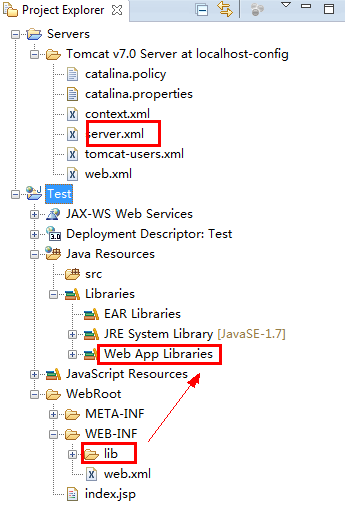 现在的目录如下图。拷贝到WEB-INF\lib里的jar包会自动加到classpath中。还能配置Tomcat