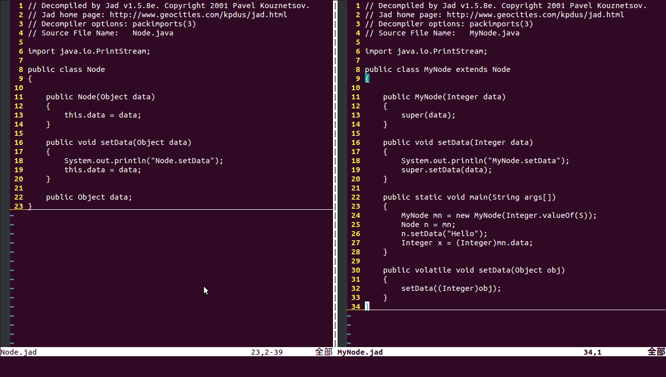 public class Node<T> { private T data; private Node<T> next; public Node(T data, Node<T> next) } this.data = data; this.next = next; } public T getData() { return data; } // ...}public class Node { private Object data; private Node next; public Node(Object data, Node next) { this.data = data; this.next = next; } public Object getData() { return data; } // ...}public class Node<T extends Comparable<T>> { private T data; private Node<T> next; public Node(T data, Node<T> next) { this.data = data; this.next = next; } public T getData() { return data; } // ...}public class Node { private Comparable data; private Node next; public Node(Comparable data, Node next) { this.data = data; this.next = next; } public Comparable getData() { return data; } // ...}public class Node<T> { public T data; public Node(T data) { this.data = data; } public void setData(T data) { System.out.println("Node.setData"); this.data = data; }}public class MyNode extends Node<Integer> { public MyNode(Integer data) { super(data); } public void setData(Integer data) { System.out.println("MyNode.setData"); super.setData(data); }}MyNode mn = new MyNode(5);Node n = mn; n.setData("Hello"); Integer x = mn.data;