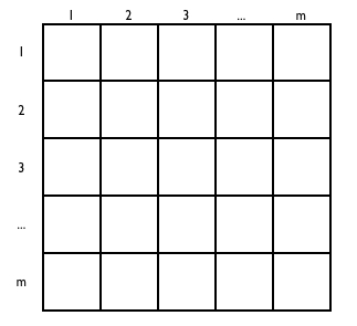 对于文章开头提到的T1、T2、T3进行Join的问题,可以通过一个Map-Reduce过程来完成,在Map阶段,我们将T1和T3文件中的所有记录复制给所有的Reducer,而T2中的记录则按照Reducer进行切分,每个Reducer只处理T2中的一部分数据。这样每个Reducer各自完成一部分数据的Join,所有Reducer所产生的结果加到一起,就可以形成完成的结果。虽然,数据的复制到只了存储和Map阶段数据通信的成本,但是整个Join过程被放到了一个Map-Reduce任务中,执行效率被提高了,我们可以更快速的得到结果。算法的优化这个算法可以被进行优化,这里对优化的方法进行一个大概的介绍。首先,假设我们将会实用k=m2个Reducer来完成T1、T2和T3三个文件的Join,其中m是一个任意的数字。B列和C列上的值通过一个哈希函数之后,可以被映射到[1, m]之间的一个值上,这个哈希函数我们命名为h。这样一来,这m2个Reducer就会形成一个矩阵,如下图所示: