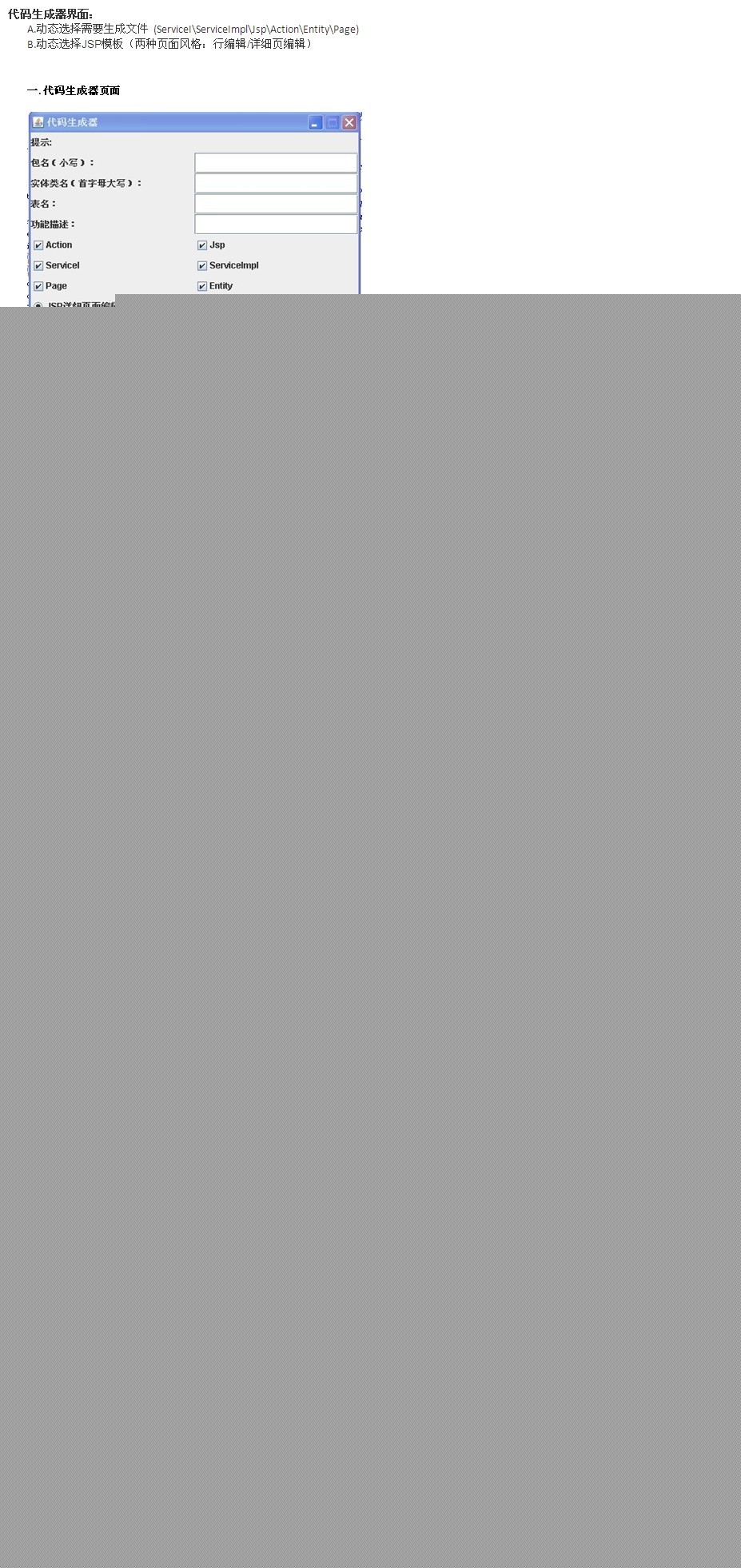 前言:随着WEB UI框架(EasyUi/Jquery UI/Ext)等的逐渐成熟,系统界面逐渐实现统一化,代码生成器也可以生成统一规范的界面!代码生成+手工MERGE半智能开发将是新的趋势,单表数据模型和一对多数据模型的增删改查功能直接生成使用,可节省50%工作量,快速提高开发效率!!!