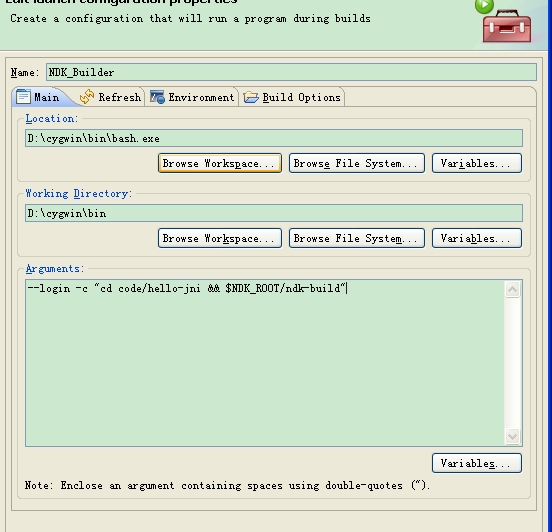 以上所有路径请修改为你的实际路径。其原理就是让编译器在cygwin的linux环境中执行“cd code/hello-jni && $NDK_ROOT/ndk-build”命令