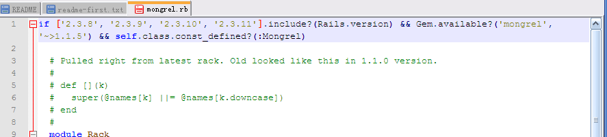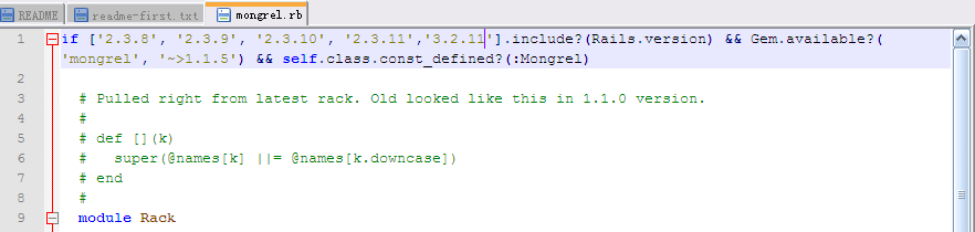 1.先进入DOS界面,键入:rails --version,查看rails的版本,如果rails的版本不大于2.3.11,那么rails和mongrel是可以兼容的,如果你的rails的版本超过2.3.11,你就需要下载一个mongrel.rb的文件,