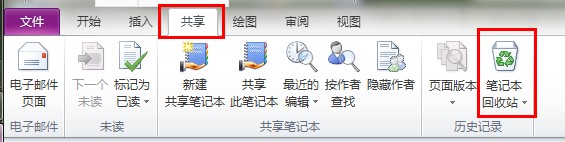 Onenote2010恢复被误删的笔记分区或页面 有时候会不小心删除了笔记分区或者页面,在电脑回收站里又找不到,这是因为onenote有自己专用的回收站。找回的方法是:打开onenote2010“共享”选项卡,选择“历史记录”分选项里的“笔记本回收站”,然后就可以看到所有已删除的分区和页面,把要恢复的分区或页面直接拖到相应的位置就可以了。