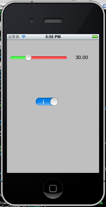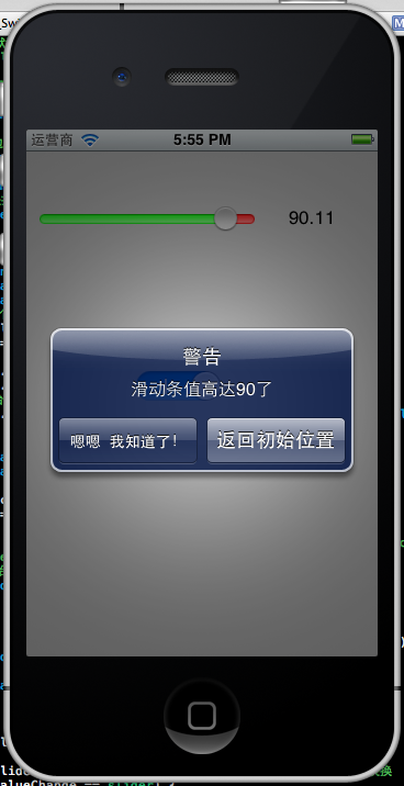 本次实现的UISlider和UISwitch控件用代码实现的一些简单功能,拖动slider 在label上显示slider的值,当slider值大于90的时候,弹出一个警告;switch在变换开关的时候,实现隐藏事件:功能如下: