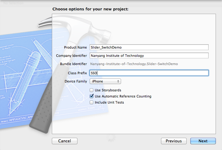 1.创建一个新工程叫Slider_SwitchDemo; File->New->Project ->single View Application -> next