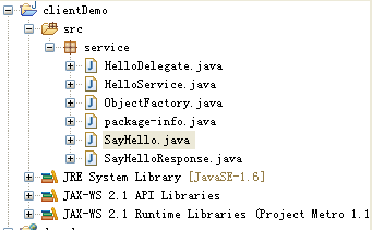 package test;import service.HelloDelegate;import service.HelloService;public class TestDemo {public static void main(String[] args) {HelloService service=new HelloService();HelloDelegate post=service.getHelloPort();String str=post.sayHello("Tom");System.out.println(str);}}