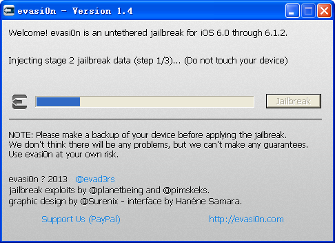 ipad2 6.1.2越狱工具evasi0n-win-1.4下载 ipad2最新的可更新的版本6.1.2已经可以越狱,附件是下载的最新对此版本可以越狱的越狱工具evasi0n-win-1.4.exe截图下载解压后的图标正在越狱当然也可以去官网下载,如果可以访问的话http://evasi0n.com/