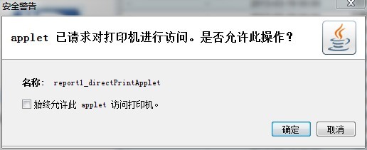 这样的警告框,选择了“始縂允许applet访问打印机”在下次点击打印按钮时还是出现这样的警告框。现在也没有好的方案,现在想到是修改客户端JRE中的配置: