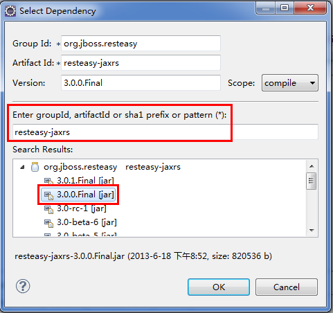 2.2 在查询栏中输入“resteasy-jaxrs”,在查询结果中选择版本3.0.0
