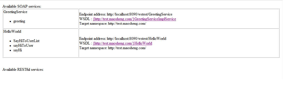 7 访问 http://localhost:8090/wstest 查看Available SOAP services。