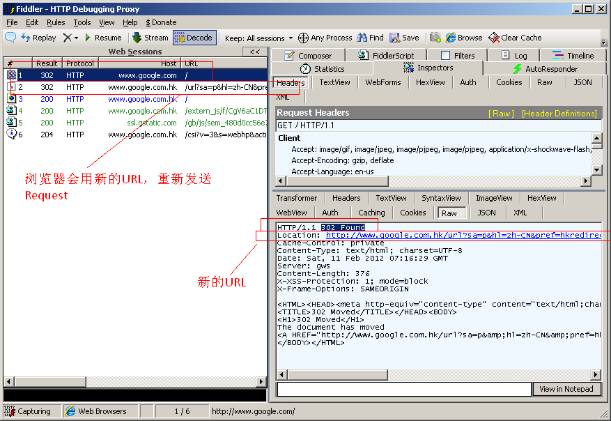 例如在IE中输入, http://www.google.com. HTTP服务器会返回302, IE取到Response中Location header的新URL, 又重新发送了一个Request.