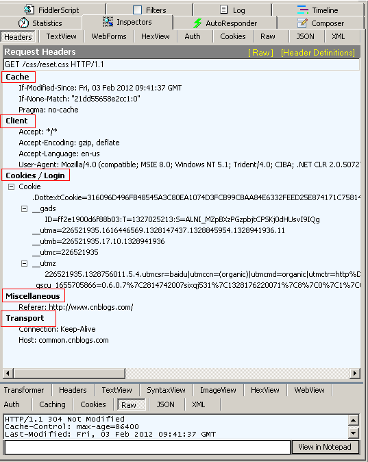 下面我们打开Fiddler 捕捉一个博客园登录的Request 然后分析下它的结构, 在Inspectors tab下以Raw的方式可以看到完整的Request的消息, 如下图