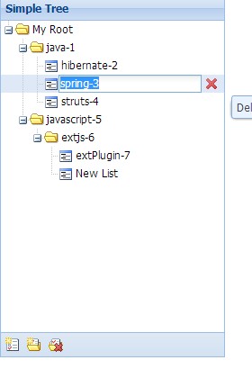 /** * 定义树节点 */public class TreeNode {//IDprivate int id;//展示数时显示的文本private String text;//是否是叶子节点private boolean leaf;//子节点的集合//(@JsonInclude(Include.NON_NULL)序列化时的标记 如果为空则不参与序列化)@JsonInclude(Include.NON_NULL) private List<TreeNode> children;public TreeNode() {}public TreeNode(int id, String text, boolean leaf) {super();this.id = id;this.text = text;this.leaf = leaf;}public TreeNode(int id, String text, boolean leaf, List<TreeNode> children) {super();this.id = id;this.text = text;this.leaf = leaf;this.children = children;}public int getId() {return id;}public void setId(int id) {this.id = id;}public String getText() {return text;}public void setText(String text) {this.text = text;}public boolean isLeaf() {return leaf;}public void setLeaf(boolean leaf) {this.leaf = leaf;}public List<TreeNode> getChildren() {return children;}public void setChildren(List<TreeNode> children) {this.children = children;}}package com.sshe.operation.controller;import java.util.ArrayList;import java.util.List;import org.springframework.stereotype.Controller;import org.springframework.ui.ModelMap;import org.springframework.web.bind.annotation.RequestMapping;import org.springframework.web.bind.annotation.ResponseBody;import com.sshe.base.controller.BaseController;import com.sshe.operation.entity.TreeNode;/** * 控制层,我用的Spring3 MVC * 4个方法分别与Extjs的API对应 * api: { * create: 'TreeApiController.do?method=createTreeNode', * read: 'TreeApiController.do?method=queryTreeList', * update: 'TreeApiController.do?method=updateTreeNode', * destroy: 'TreeApiController.do?method=destroyTreeNode' * } */@Controller@RequestMapping("/TreeApiController.do")public class TreeApiController extends BaseController {/** * 查询的方法 * 对应 read: 'TreeApiController.do?method=queryTreeList' */@ResponseBody@RequestMapping(params="method=queryTreeList")public Object queryTreeList(ModelMap map) {System.out.println(map);JsonResult result = new JsonResult();result.setSuccess(true);result.setData(getTreeList());return getTreeList();}/** * 新增方法 * 对应create: 'TreeApiController.do?method=createTreeNode' */@ResponseBody@RequestMapping(params="method=createTreeNode")public Object createTreeNode(ModelMap map) {System.out.println(map);JsonResult result = new JsonResult();result.setSuccess(true);return result;}/** * 更新的方法 * 对应 update: 'TreeApiController.do?method=updateTreeNode' */@ResponseBody@RequestMapping(params="method=updateTreeNode")public Object updateTreeNode(ModelMap map) {System.out.println(map);JsonResult result = new JsonResult();result.setSuccess(true);return result;}/** * 删除的方法 * 对应 destroy: 'TreeApiController.do?method=destroyTreeNode' */@ResponseBody@RequestMapping(params="method=destroyTreeNode")public Object destroyTreeNode(ModelMap map) {System.out.println(map);JsonResult result = new JsonResult();result.setSuccess(true);return result;}/** * 测试数据 */public List<TreeNode> getTreeList() {List<TreeNode> list = new ArrayList<TreeNode>();TreeNode java = new TreeNode(1, "java-1", false, new ArrayList<TreeNode>());TreeNode hibernate = new TreeNode(2, "hibernate-2", true);TreeNode spring = new TreeNode(3, "spring-3", true);TreeNode struts = new TreeNode(4, "struts-4", true);java.getChildren().add(hibernate);java.getChildren().add(spring);java.getChildren().add(struts);TreeNode javascript = new TreeNode(5, "javascript-5", false, new ArrayList<TreeNode>());TreeNode extjs = new TreeNode(6, "extjs-6", false, new ArrayList<TreeNode>());javascript.getChildren().add(extjs);TreeNode extPlugin = new TreeNode(7, "extPlugin-7", true);extjs.getChildren().add(extPlugin);list.add(java);list.add(javascript);return list;}}Ext.onReady(function() {//GUIDfunction newGuid() { var guid = ""; for (var i = 1; i <= 32; i++){ var n = Math.floor(Math.random()*16.0).toString(16); guid += n; if((i==8)||(i==12)||(i==16)||(i==20)) guid += "-"; } return guid; } //ToopitpExt.tip.QuickTipManager.init();//定义菜单Ext.define('SimpleTasks.view.lists.ContextMenu', { extend: 'Ext.menu.Menu', xtype: 'listsContextMenu', items: [ { text: 'New List', iconCls: 'tasks-new-list', id: 'new-list-item' }, { text: 'New Folder', iconCls: 'tasks-new-folder', id: 'new-folder-item' }, { text: 'Delete', iconCls: 'tasks-delete-folder', id: 'delete-folder-item' } ]});//ModelExt.define('MyTreeModel', { extend: 'Ext.data.Model', fields: [ {name: 'id', type: 'string'}, {name: 'text', type: 'string'}, {name: 'index', type: 'int', persist: true} ] }); //StoreExt.define("MyTreeStore", {extend: "Ext.data.TreeStore",model: 'MyTreeModel',proxy: { type: 'ajax', api: { create: 'TreeApiController.do?method=createTreeNode', read: 'TreeApiController.do?method=queryTreeList', update: 'TreeApiController.do?method=updateTreeNode', destroy: 'TreeApiController.do?method=destroyTreeNode' }, writer: { type: 'json', allowSingle: false, encode: true, root: 'records' } }, root: { id: -1, expanded: true, text: "My Root" }, autoLoad: true});var store = Ext.create("MyTreeStore");Ext.define("MyTreePanel", {extend: 'Ext.tree.Panel', title: 'Simple Tree', width: 250, height: 400, store: store, hideHeaders: true, rootVisible: true, viewConfig: { plugins: { ptype: 'treeviewdragdrop' }, listeners: { drop: function(node, data, dropRec, dropPosition) { store.sync(); } } }, initComponent: function() { var me = this; //可编辑 me.plugins = [me.cellEditingPlugin = Ext.create('Ext.grid.plugin.CellEditing')]; //定义列 me.columns = [{ xtype: 'treecolumn', dataIndex: 'text', flex: 1, editor: { xtype: 'textfield', selectOnFocus: true, validator: function(value){ value = Ext.String.trim(value); return value.length < 1 ? this.blankText : true; } } },{ xtype: 'actioncolumn', width: 24, icon: 'resources/images/delete.png', iconCls: 'x-hidden', tooltip: 'Delete', handler: Ext.bind(me.handleDeleteClick, me) }]; //定义底部tbar me.dockedItems = [{ xtype: 'toolbar', dock: '