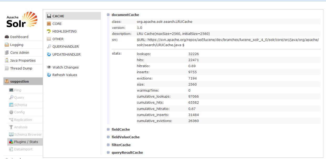 我们可以通过solr管理界面查看缓存的状态,也可以通过日志进行查看。下图是我进行的参数设置后的状态: