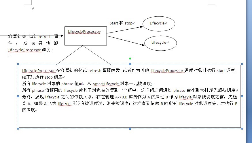 LifecycleProcessor在容器初始化或refresh事情触发,或者作 为其他 LifecycleProcessor调度对象时执行start调度,结束时执行stop调度所有lifecycle对象的phrase值=0,和smartLifecycle对象一起被调度;所有phrase值相同的lifecycle或其子对象被放置到一个组中,这样组之间通过phrase 由小到大排序先后被调度最终,发现lifecycle之间的依赖关系,存在管理A->B,B实例作为A的属性,B作 为lifecyle 对象被调度之前,先检查A,如果A也为lifecyle且没有被调度过,则