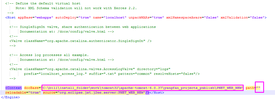 <Context path="/hello" docBase="F:\eclipse3.2\workspace\hello\WebRoot" debug="0" privileged="true"> </Context>