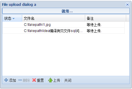 <!DOCTYPE HTML PUBLIC "-//W3C//DTD HTML 4.01 Transitional//EN" "http://www.w3.org/TR/html4/loose.dtd"><html> <head> <title> 我的ext测试页面-上传 </title> <Meta http-equiv="Content-Type" Content="text/html; Charset=utf-8"> <link rel="stylesheet" type="text/css" href="../ext/resources/css/ext-all.css"/><script type="text/javascript" src="../ext/adapter/ext/ext-base-debug.js"></script> <script type="text/javascript" src="../ext/ext-all-debug.js"></script><script type="text/javascript" src="../ext/src/locale/ext-lang-zh_CN.js"></script><script type="text/javascript" src="../ext/ux/filemgr/Ext.ux.UploadDialog/Ext.ux.UploadDialog.js"></script><link rel="stylesheet" type="text/css" href="../ext/ux/filemgr/Ext.ux.UploadDialog/Ext.ux.UploadDialog.css"/> </head><script type="text/javascript">Ext.BLANK_IMAGE_URL = '../ext/resources/images/default/s.gif';</script><script type="text/javascript">var dialog;Ext.onReady(function(){Ext.QuickTips.init();dialog = new Ext.ux.UploadDialog.Dialog({url:'',reset_on_hide:false,//是否在窗口隐藏时清空表格中的文件allow_close_on_upload:true,//是否在关闭窗口时进行上传upload_autostart:false//是否用户选择一个文件就马上上传});//dialog.show("upload_btn");});function show(){dialog.show();}</script> <body> <INPUT id="upload_btn" TYPE="button" VALUE="上传" onclick="show();"/> </body></html>